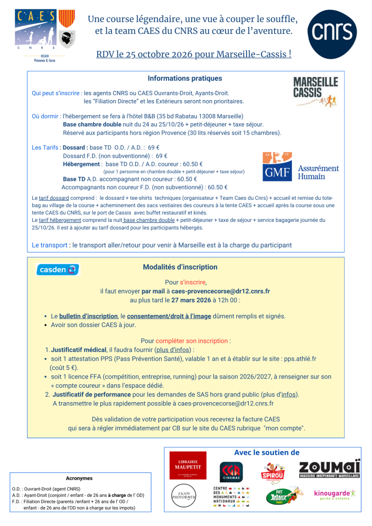 Le 25 octobre 2026, faisons équipe et portons haut les couleurs du CAES et du CNRS sur l’un des parcours les plus mythiques de France : le Marseille–Cassis !